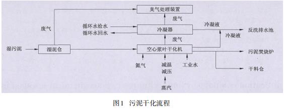 污泥干化裝置主要由儲(chǔ)存及進(jìn)料系統(tǒng)、干化機(jī)、出料系統(tǒng)、蒸汽減溫減壓系統(tǒng)、噴淋除塵等系統(tǒng)組成。工藝流程見圖1。
