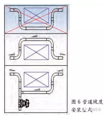 為了防止微生物滋生的風(fēng)險,在制藥潔凈管道系統(tǒng)設(shè)計中,一定要注意在系統(tǒng)放空的狀態(tài)下,保證系統(tǒng)里面的水或其他介質(zhì)可以完全排放出系統(tǒng)。因此,在潔凈管道系統(tǒng)中保持一定坡度是必要的工程規(guī)范。